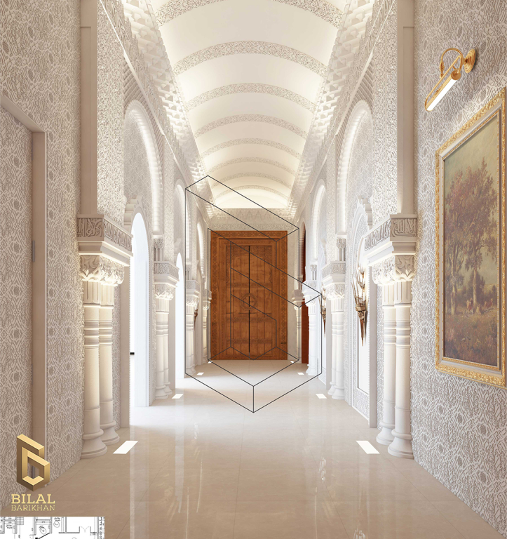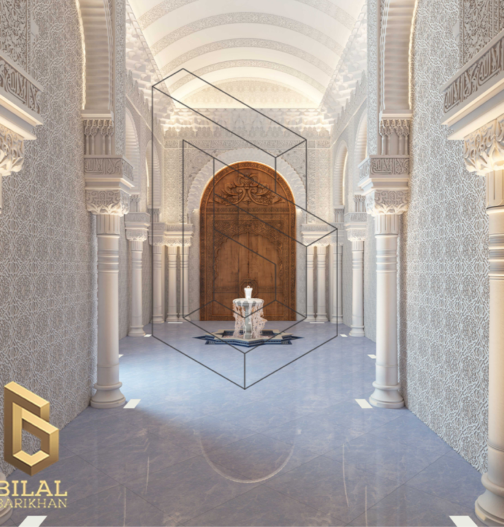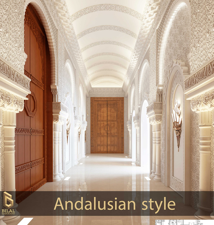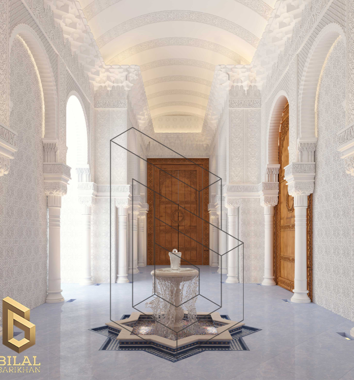 The interior design project of the villa’s entrance takes us on an enchanting journey into the world of ancient Andalusia, drawing inspiration for its refined details and decorations from the Alhambra Palace. The entrance is characterized by its elegance and luxury that radiates with a unique Andalusian style.